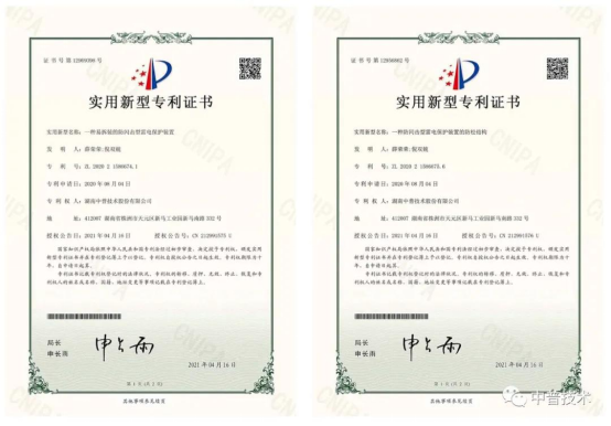 2021年4月16日,國家知識產(chǎn)權(quán)局分別授予了“一種易拆裝的防閃擊型雷電保護(hù)裝置(專利號:ZL202021586674.1)”、“一種防閃擊型雷電保護(hù)裝置的防松結(jié)構(gòu)(專利號:ZL202021586675.6)”實(shí)用新型專利權(quán)。截止至目前,公司共有授權(quán)專利134項(xiàng),其中發(fā)明專利16項(xiàng),實(shí)用新型專利96項(xiàng),外觀專利22項(xiàng)。