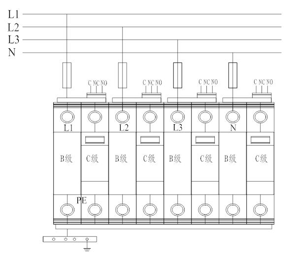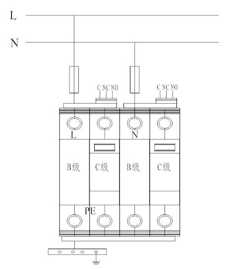 5.3  電源相線(L)、零線(N)分別接入電涌保護(hù)器相應(yīng)接線端子,保證牢固及可靠,將電涌保護(hù)器接地端與地線作良好電氣連接。
